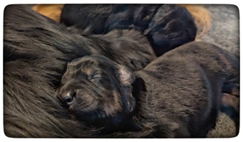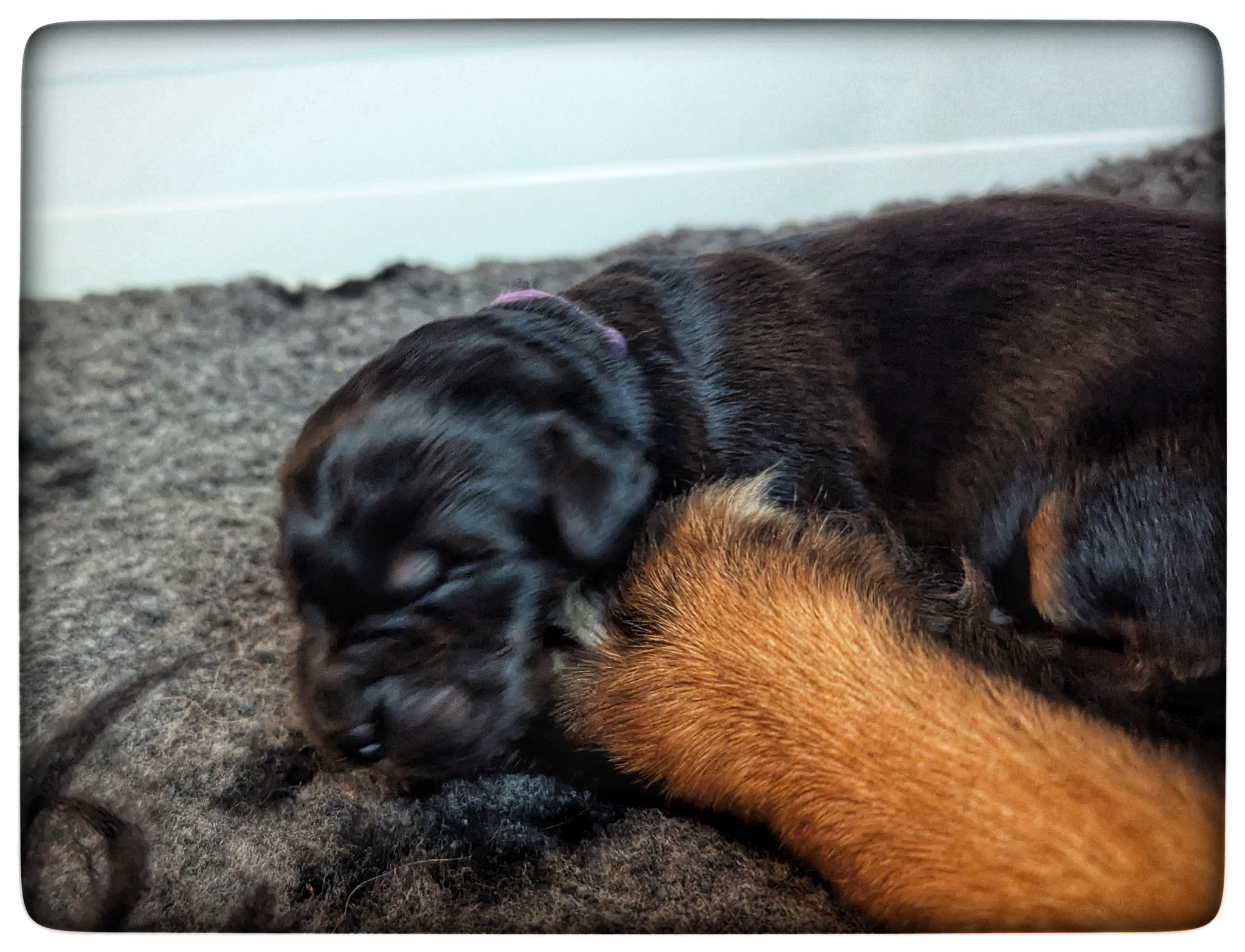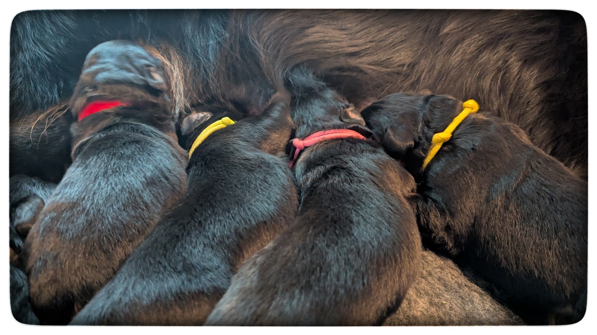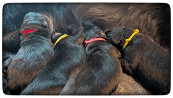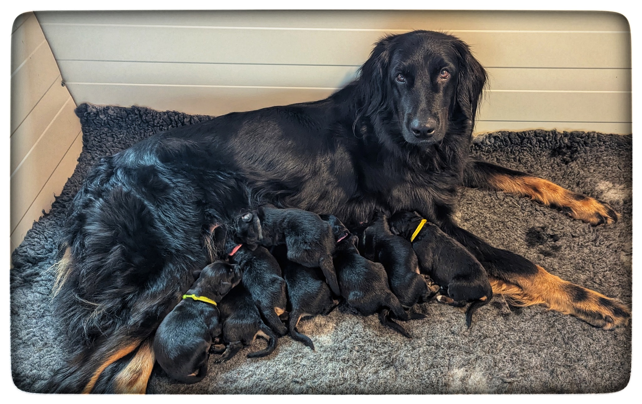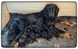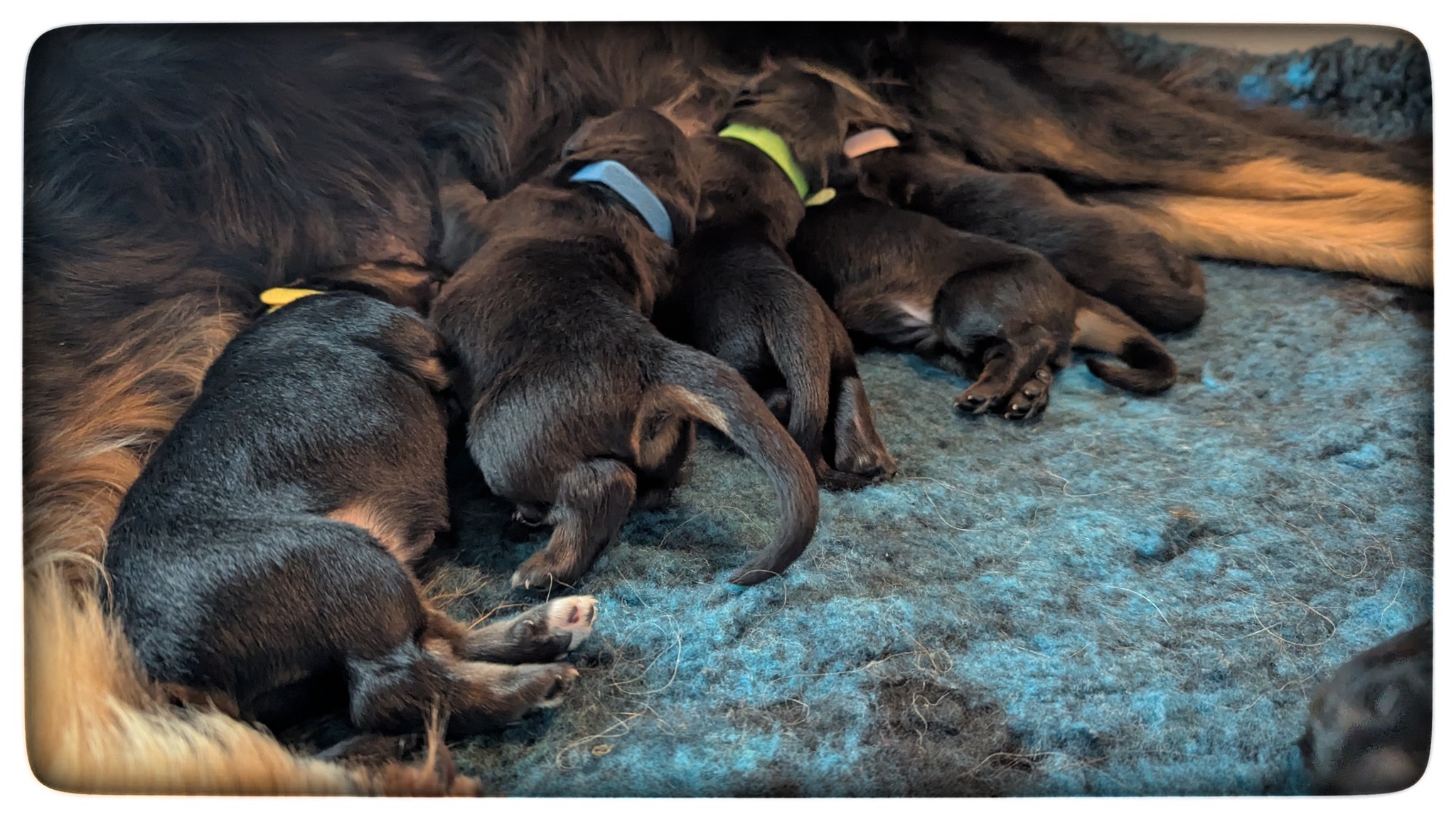 Unsere Zuchtwartin war sehr beeindruckt von der Ruhe und Gelassenheit die Cara ausstrahlt. Sie versorgt ihre Welpen sehr zuverlässig und ohne jede Hektik. Selbst wenn die Welpen mal unruhig werden oder lauthals Protestieren, leibt sie sehr souverän. Entsprechend sind auch die Zunahmen. Wir sind sehr begeistert von ihrem Verhalten. Bisher haben das zwar alle unsere Hündinnen sehr gut gemacht aber Cara ist da echt nochmal ne andere Hausnummer.