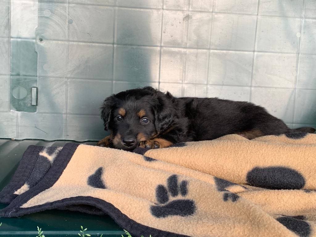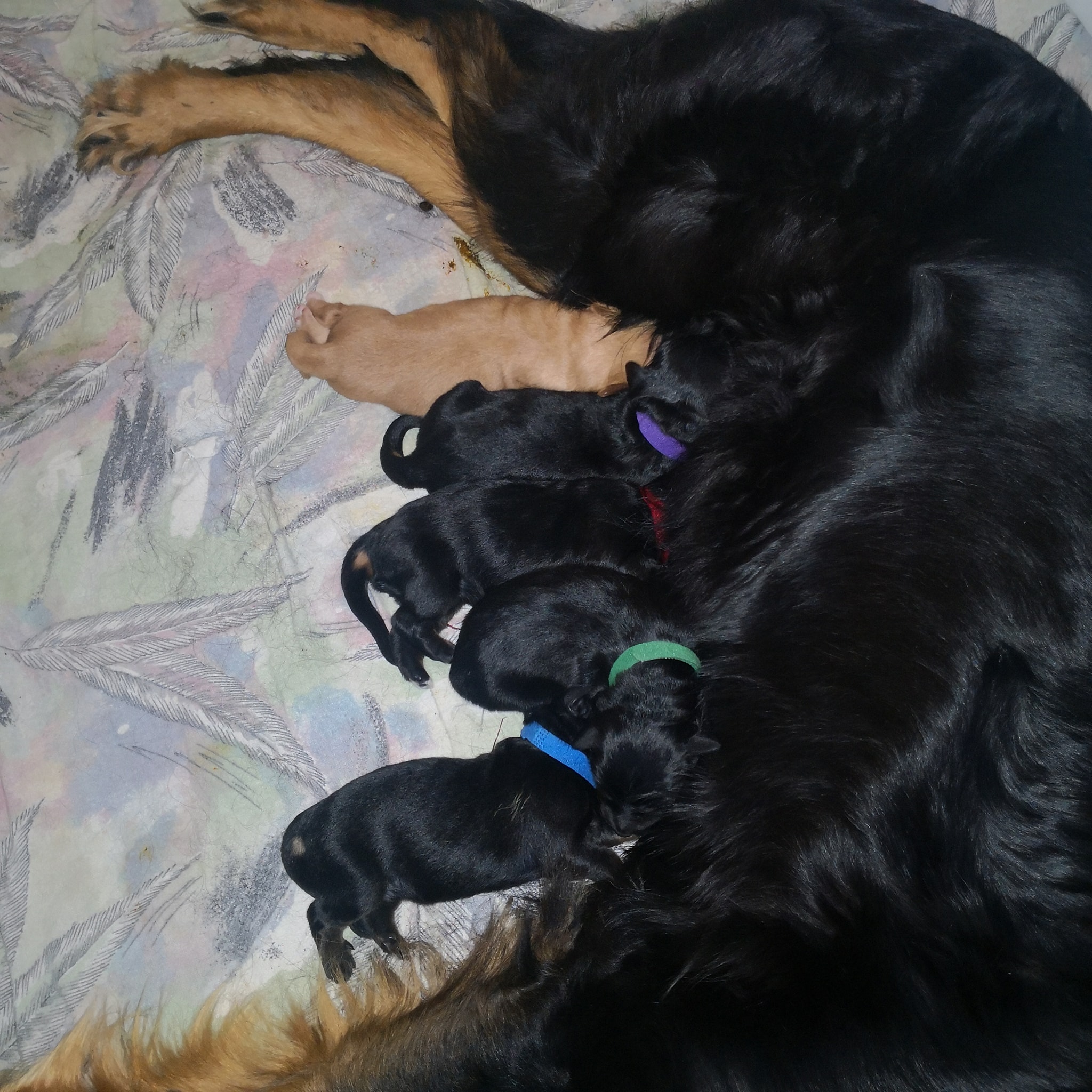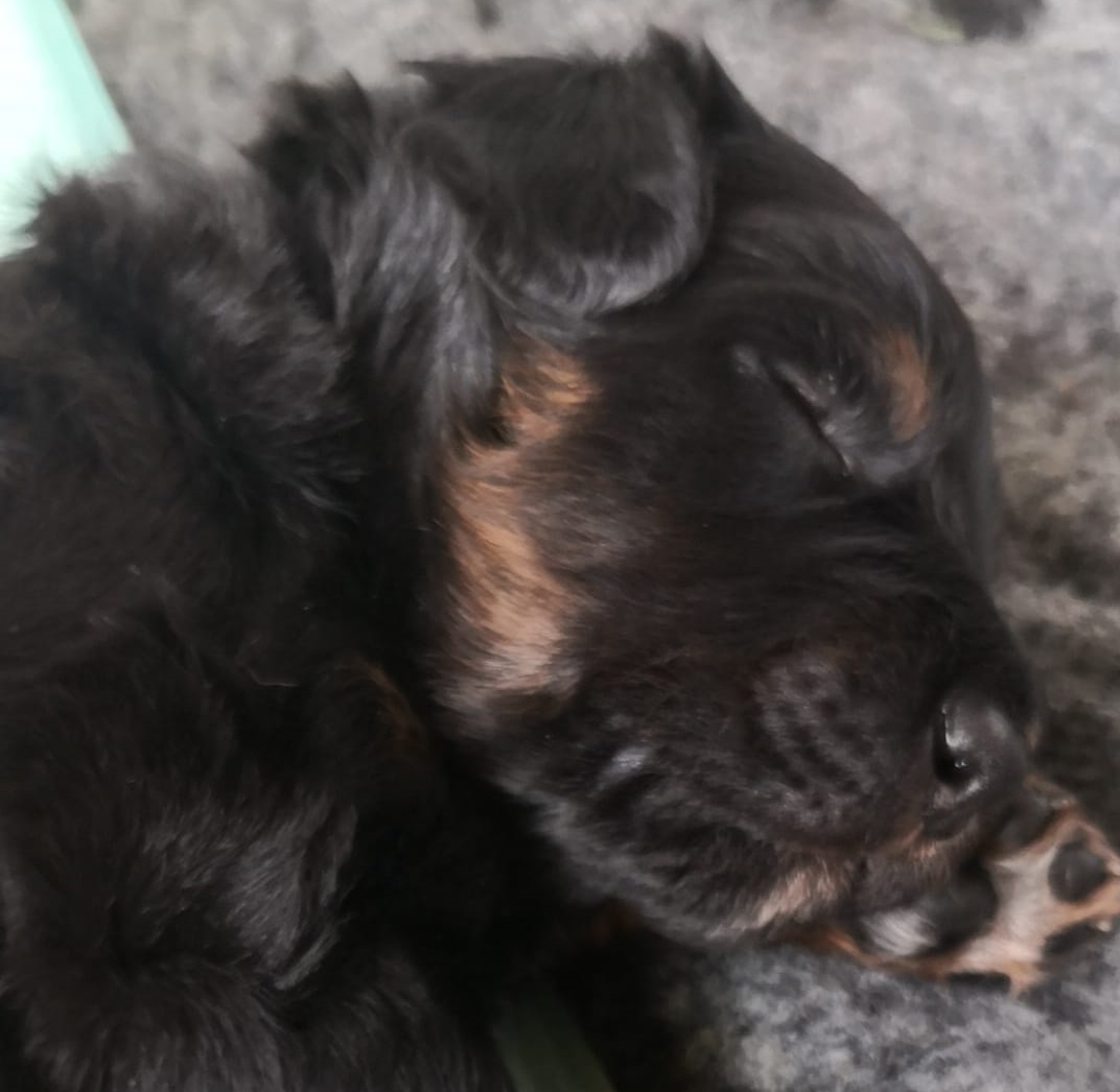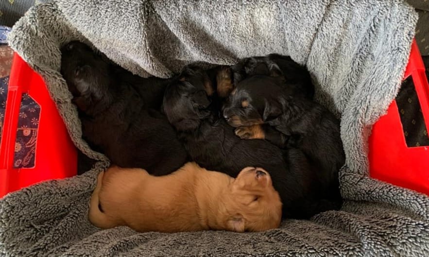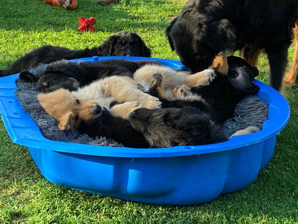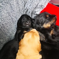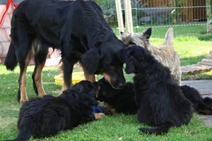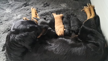 Endlich sind sie da. So lange ersehnt und gewartet. 4 Rüden, eine Hündin. Ein Rüde ist Blond, der Rest hat die Farbe schwarzmarken (schwarz mit braunen Abzeichen)