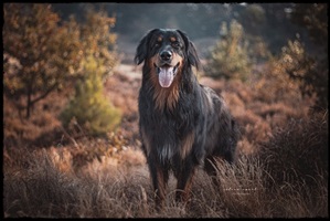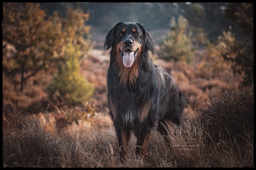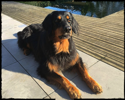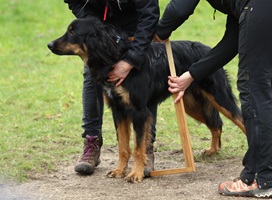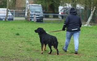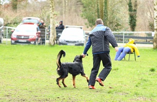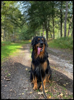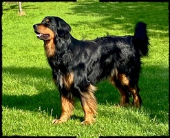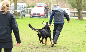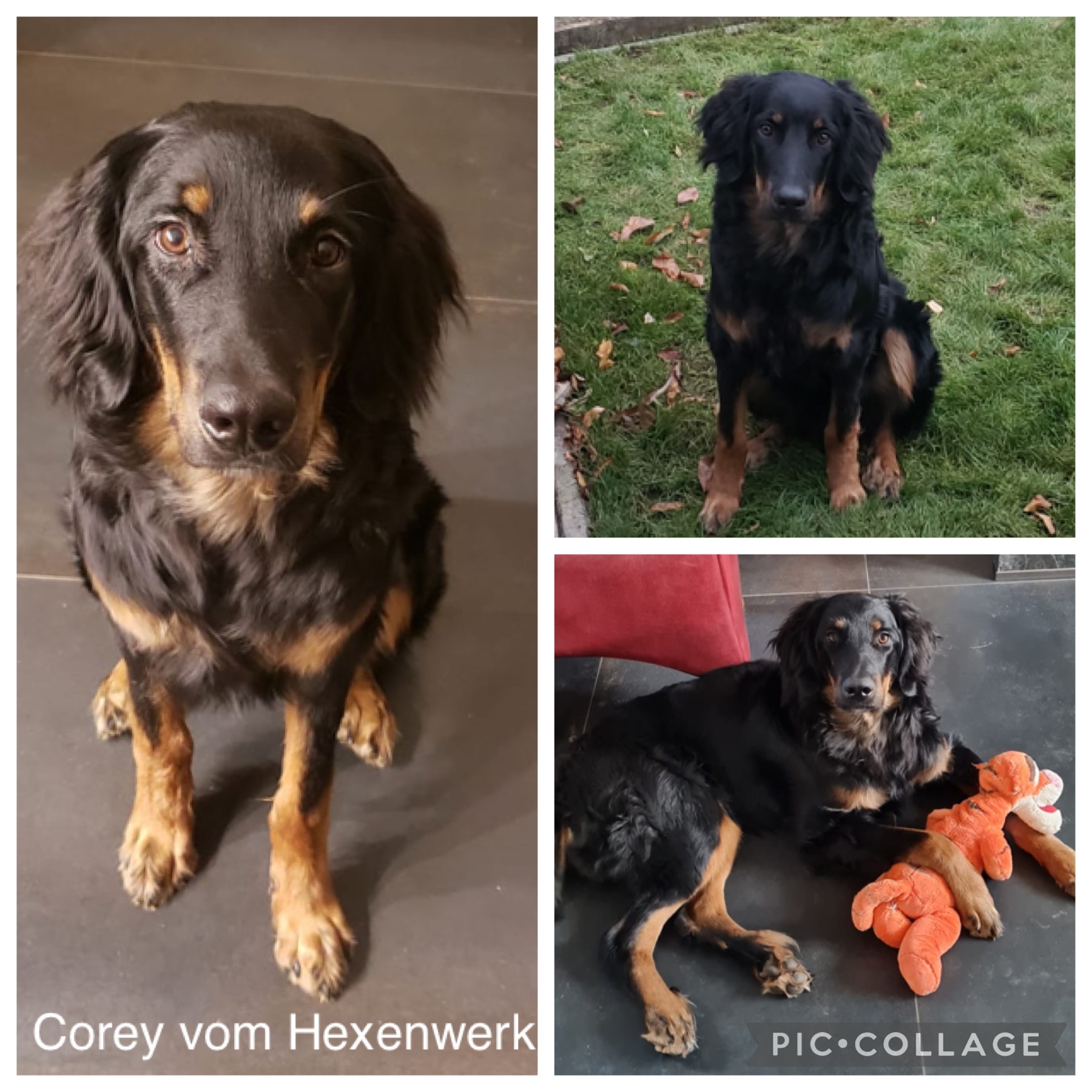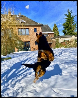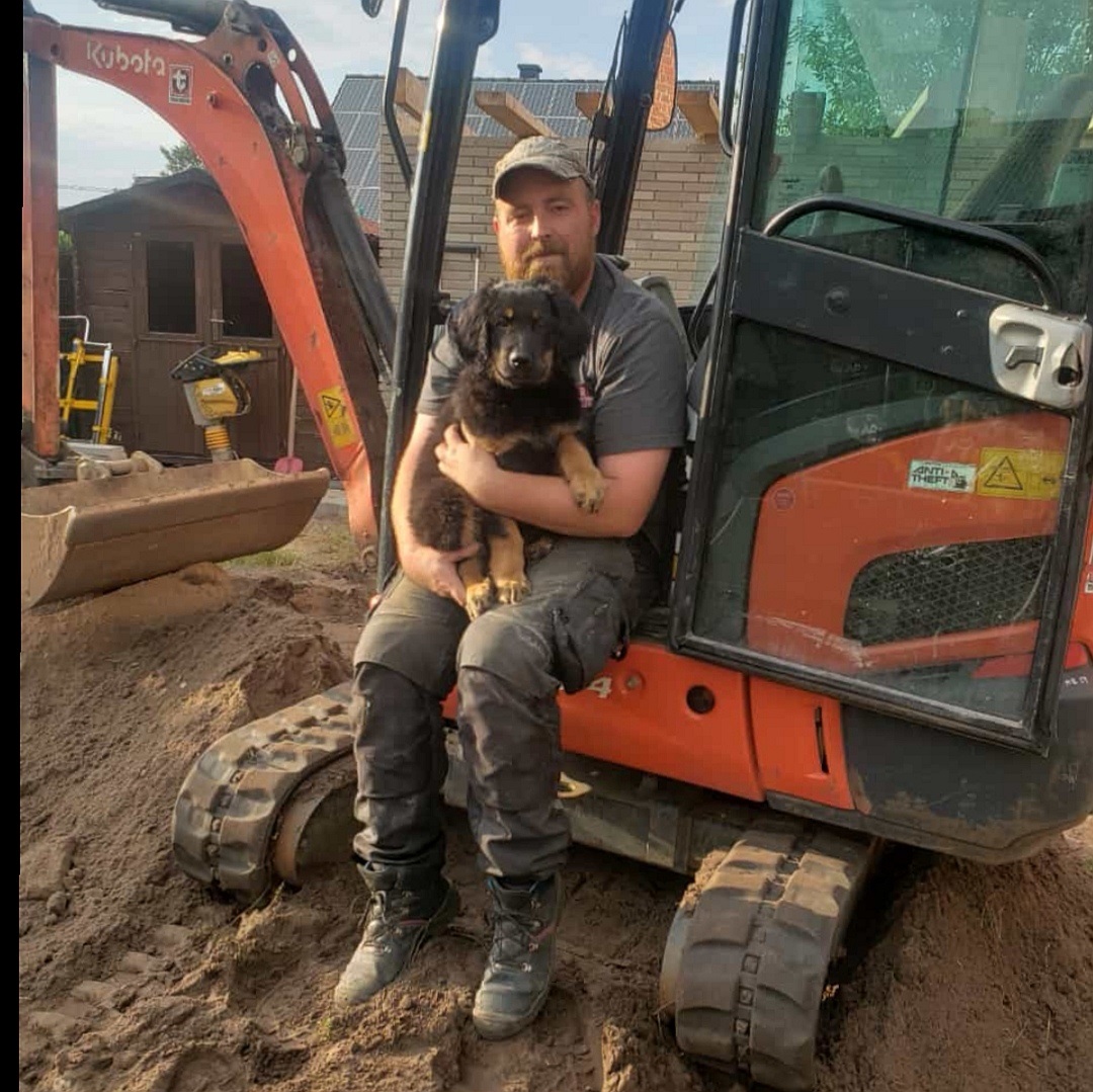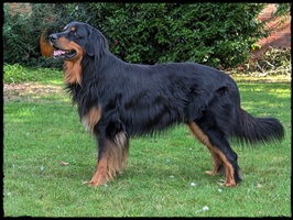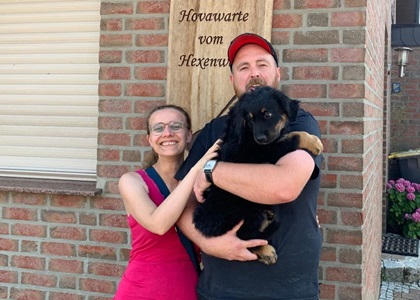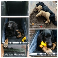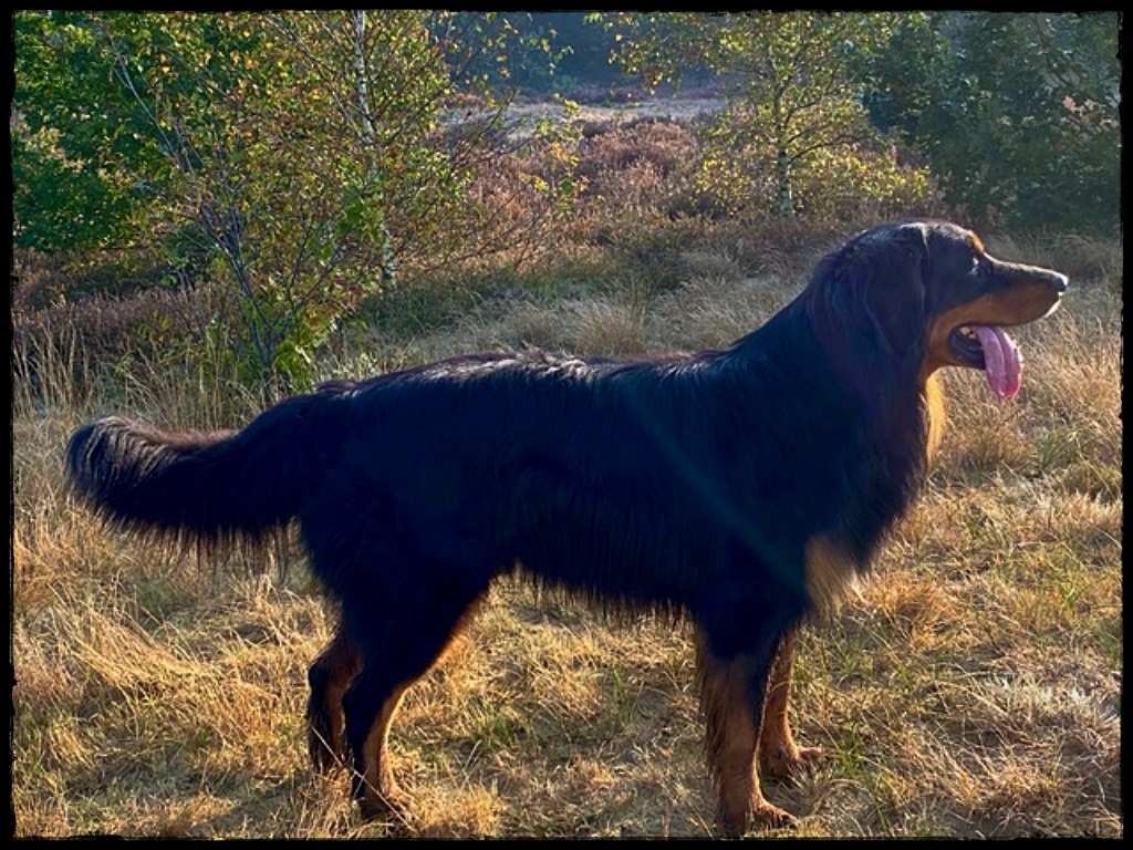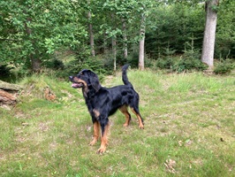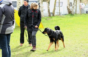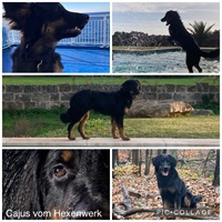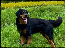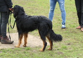 Ein 2,5 Jahre alter schwarzmarkener mittelgroßer, rassetypischer Rüde, von mittlerer Knochenstärke und mit ansprechendem Kopf. Vorzüglich gesetzte, flammende Marken, kleiner Brustfleck, Behang ohne Beanstandung, mittelbraune Augen, anliegende Lefzen, vollständiges Scherengebiss, P1 doppelt. Hamonische obere und untere Linie, korrekte Rute und einwandfreie Winkelungen. Die Läufe sind gerade gestellt. In der Bewegung zeigt sich der Rüde etwas hektisch, weshalb er sein Gangwerk nicht wirklich entfalten kann. Er läuft aber flüssig. Gepflegtes schichtes glänzendes Haarkleid. Vorzüglich am Futter. Er zeigt sich freundlich.