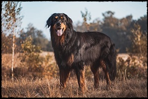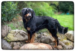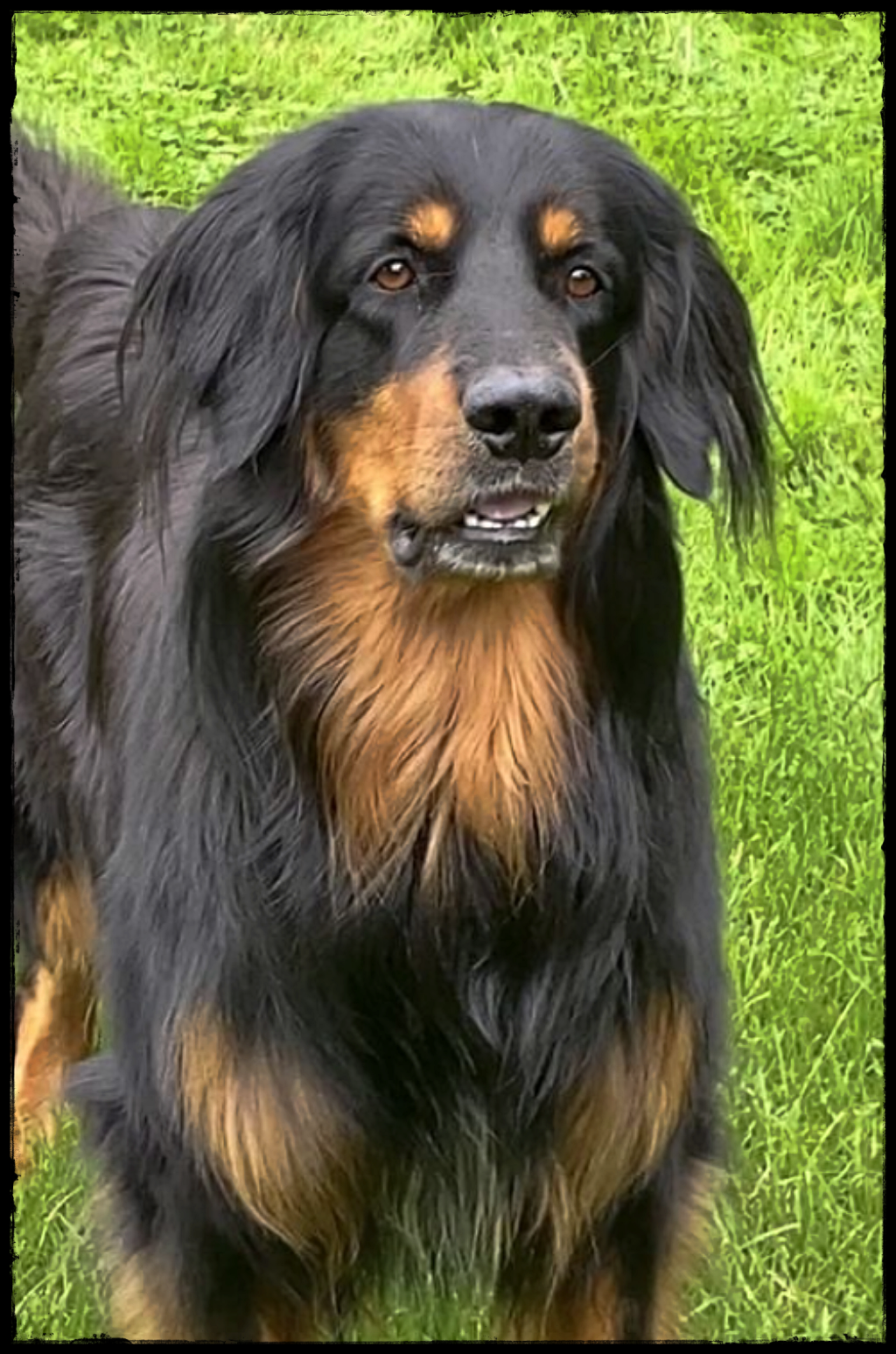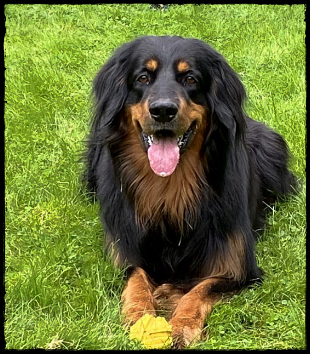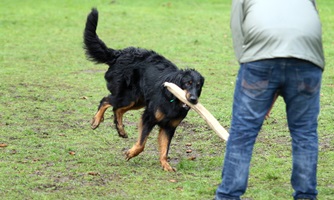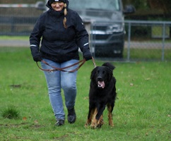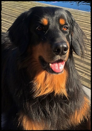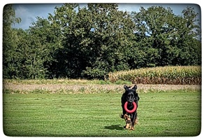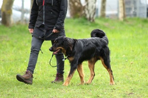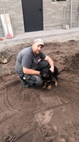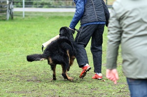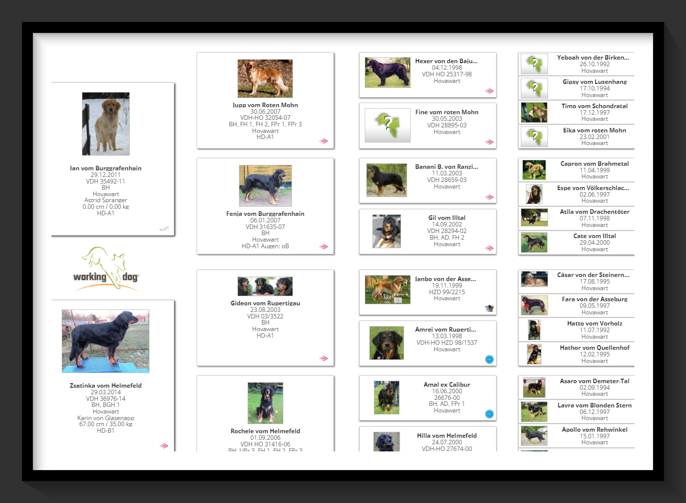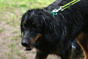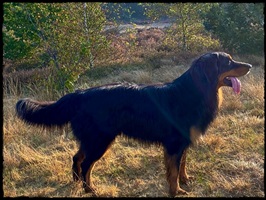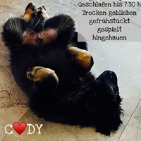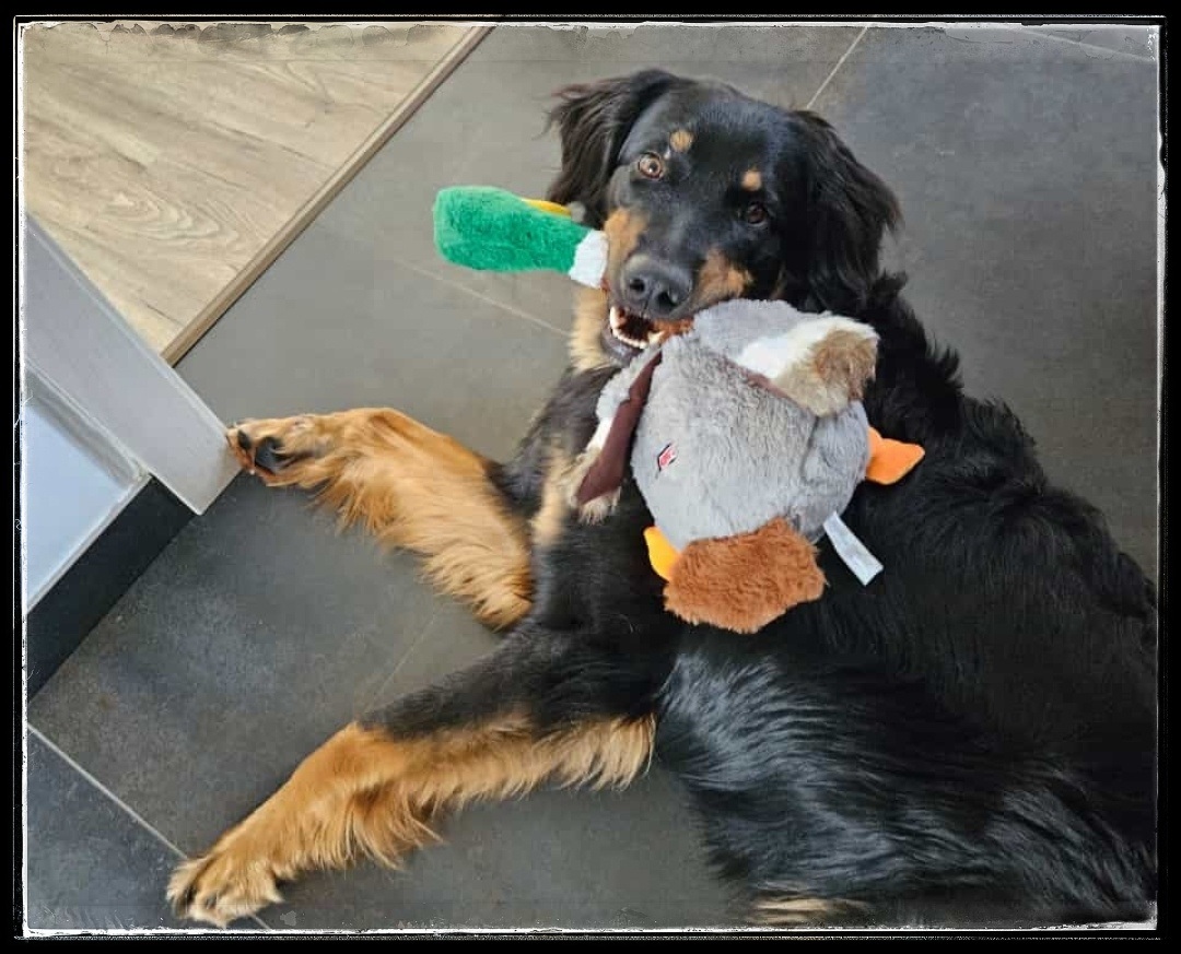 Ein 2,5 Jahre alter schwarzmarkener mittelgroßer, rassetypischer Rüde, von mittlerer Knochenstärke und mit ansprechendem Kopf. Vorzüglich gesetzte, flammende Marken, kleiner Brustfleck, Behang ohne Beanstandung, mittelbraune Augen, anliegende Lefzen, vollständiges Scherengebiss, P1 doppelt. Hamonische obere und untere Linie, korrekte Rute und einwandfreie Winkelungen. Die Läufe sind gerade gestellt. In der Bewegung zeigt sich der Rüde etwas hektisch, weshalb er sein Gangwerk nicht wirklich entfalten kann. Er läuft aber flüssig. Gepflegtes schichtes glänzendes Haarkleid. Vorzüglich am Futter. Er zeigt sich freundlich.
