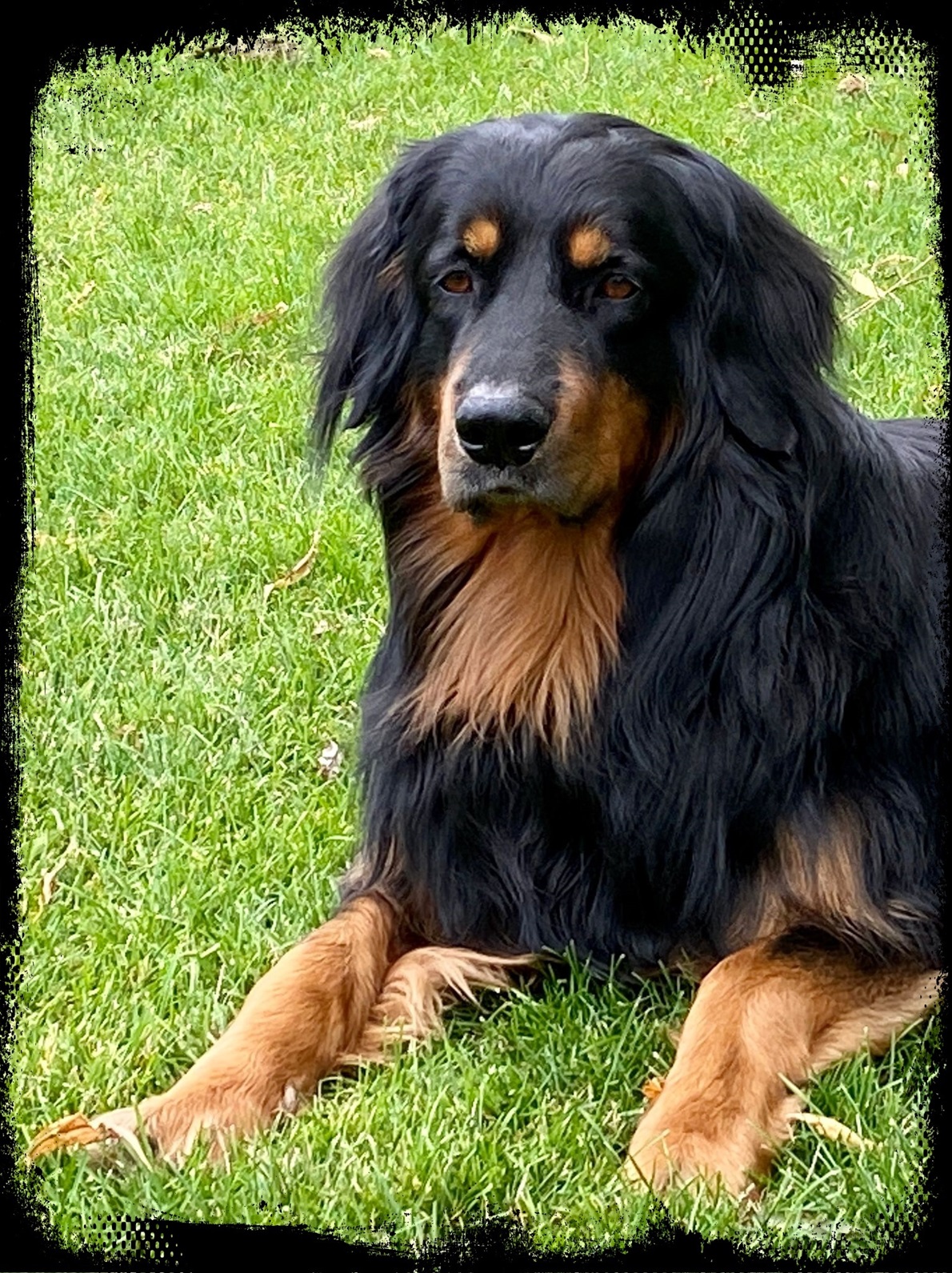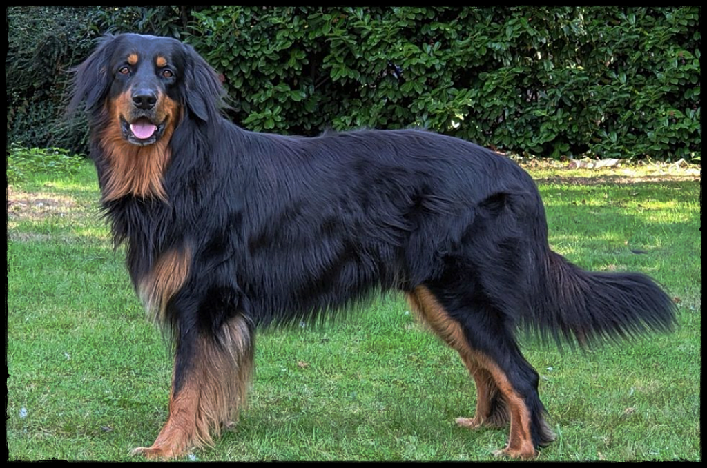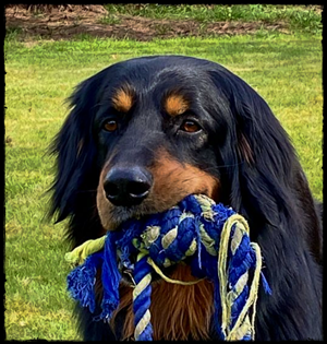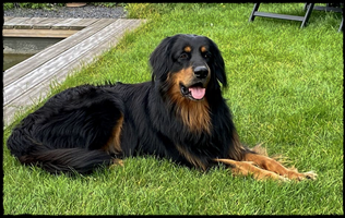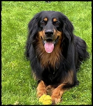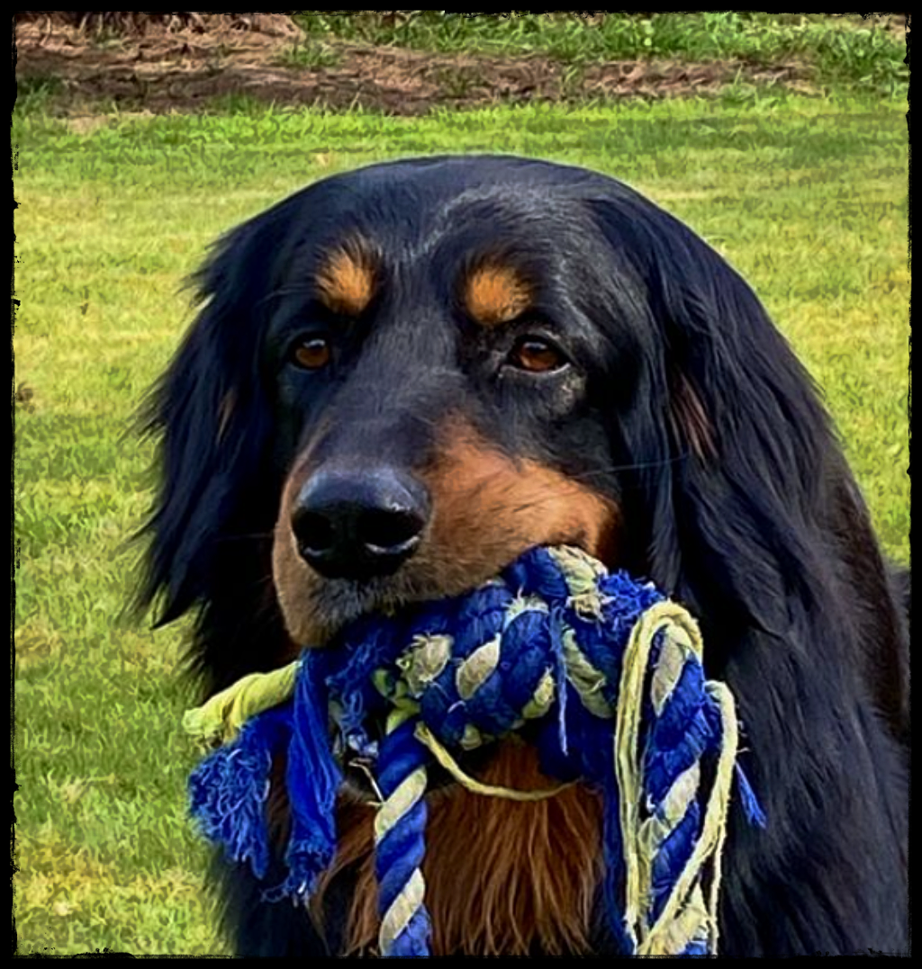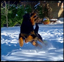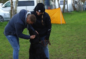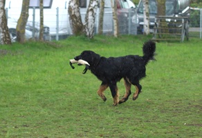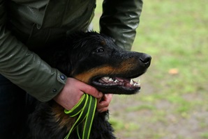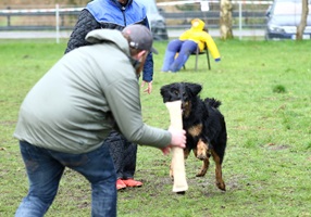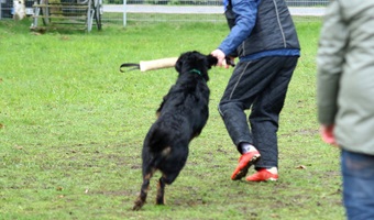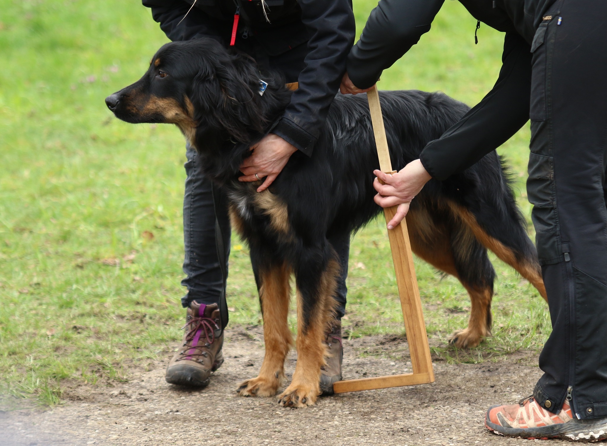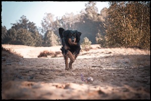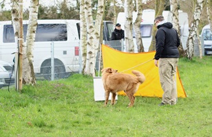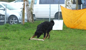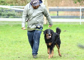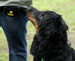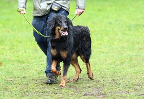 Ein 2,5 Jahre alter schwarzmarkener mittelgroßer, rassetypischer Rüde, von mittlerer Knochenstärke und mit ansprechendem Kopf. Vorzüglich gesetzte, flammende Marken, kleiner Brustfleck, Behang ohne Beanstandung, mittelbraune Augen, anliegende Lefzen, vollständiges Scherengebiss, P1 doppelt. Hamonische obere und untere Linie, korrekte Rute und einwandfreie Winkelungen. Die Läufe sind gerade gestellt. In der Bewegung zeigt sich der Rüde etwas hektisch, weshalb er sein Gangwerk nicht wirklich entfalten kann. Er läuft aber flüssig. Gepflegtes schichtes glänzendes Haarkleid. Vorzüglich am Futter. Er zeigt sich freundlich.