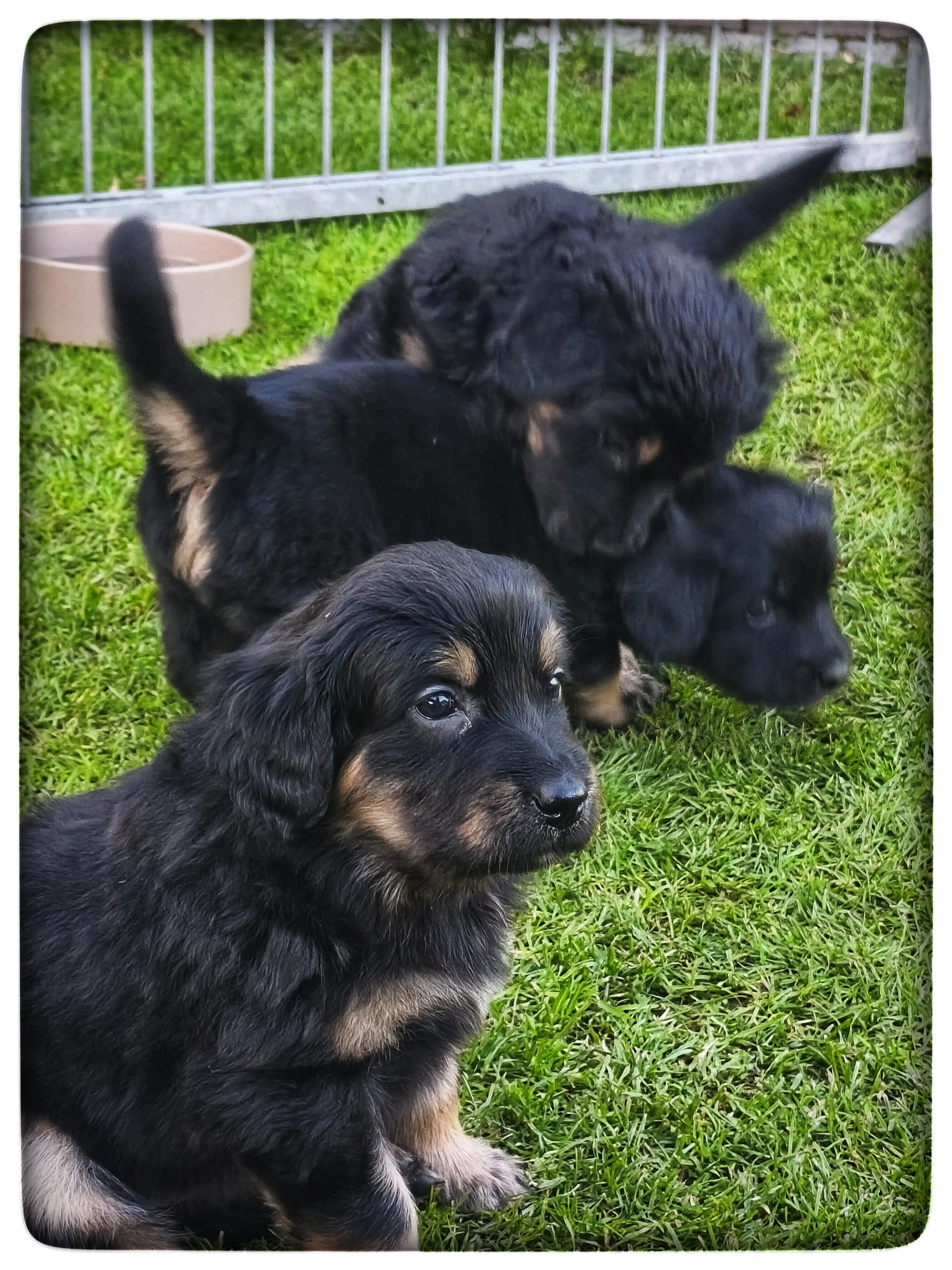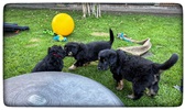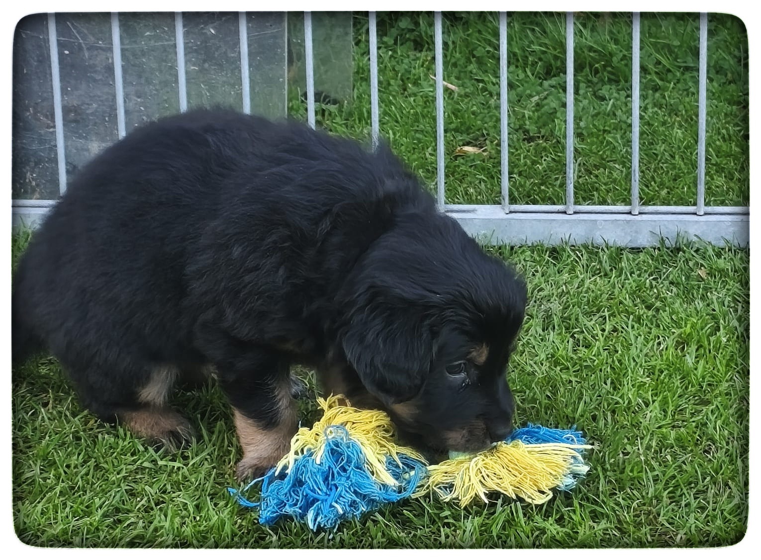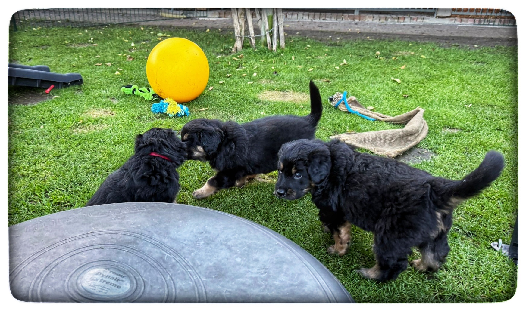 Die Welpen entwickeln sich prächtig und meistern mutig die Herausforderungen, die wir ihnen in dem Auslauf zur Verfügung stellen. Neugierig wird geäugt, was wir ihnen bereitstellen. Natürlich sind die Dinge dem Alter entsprechend angepasst.