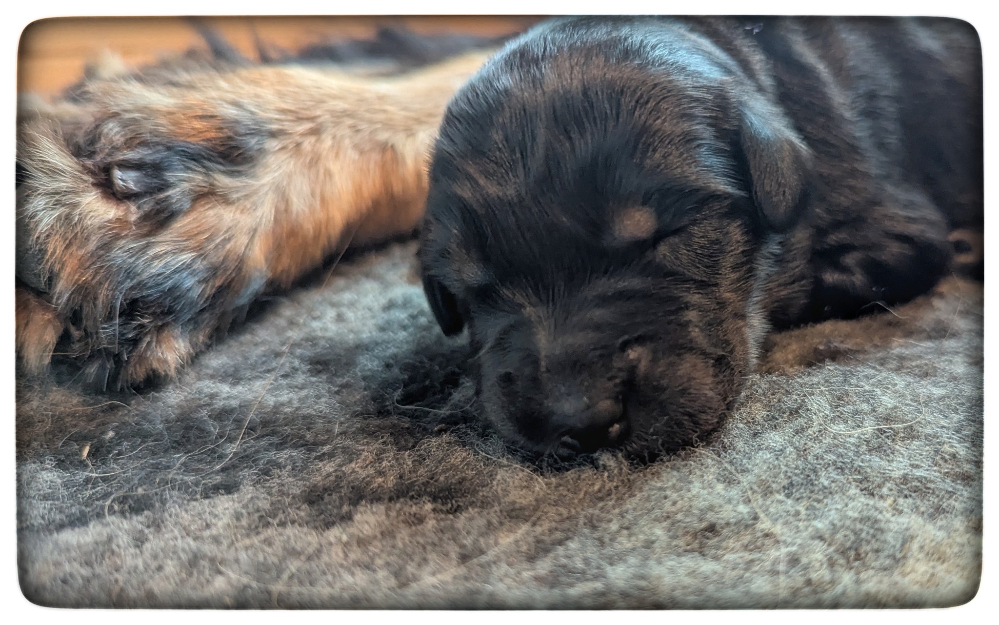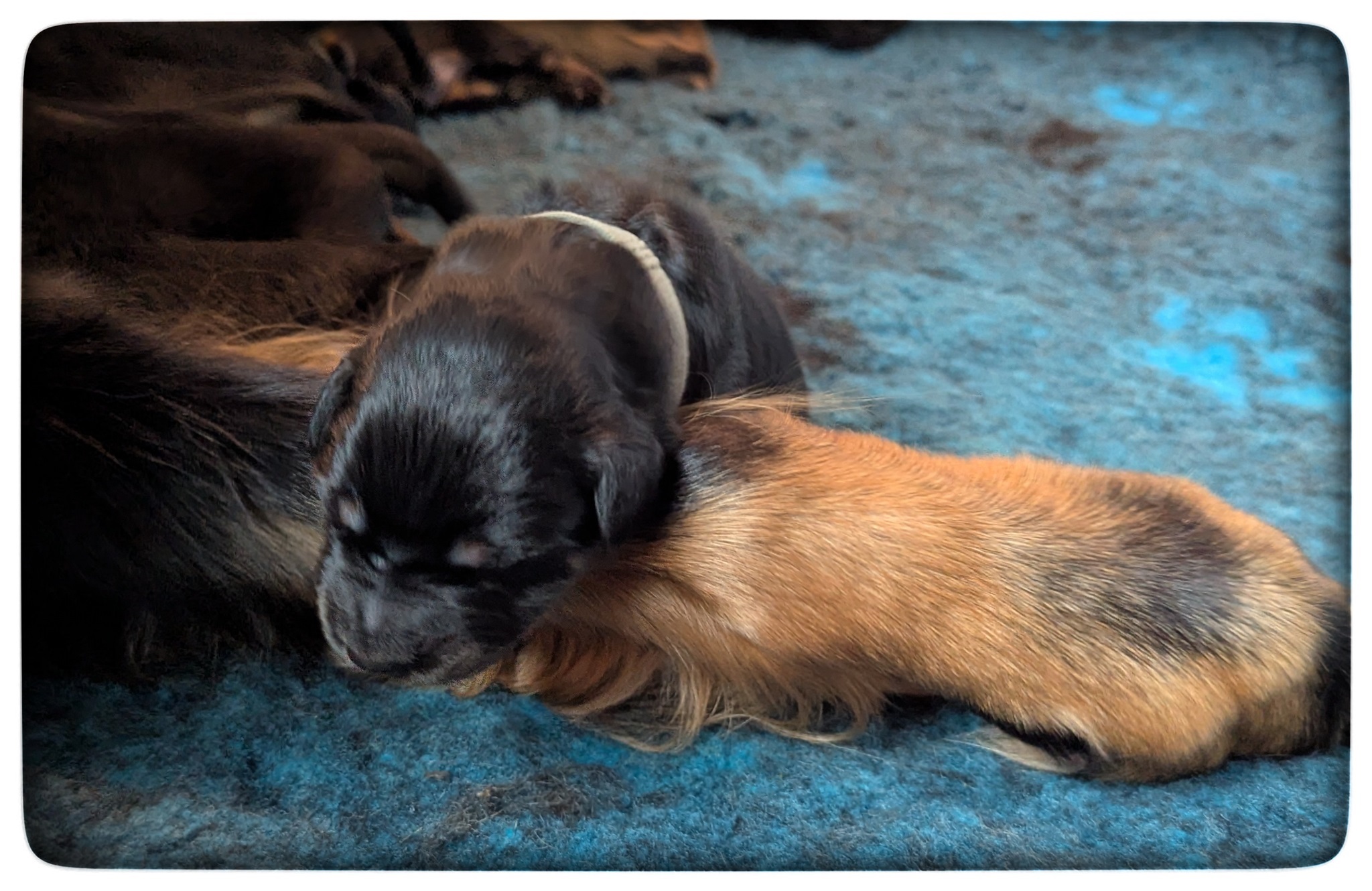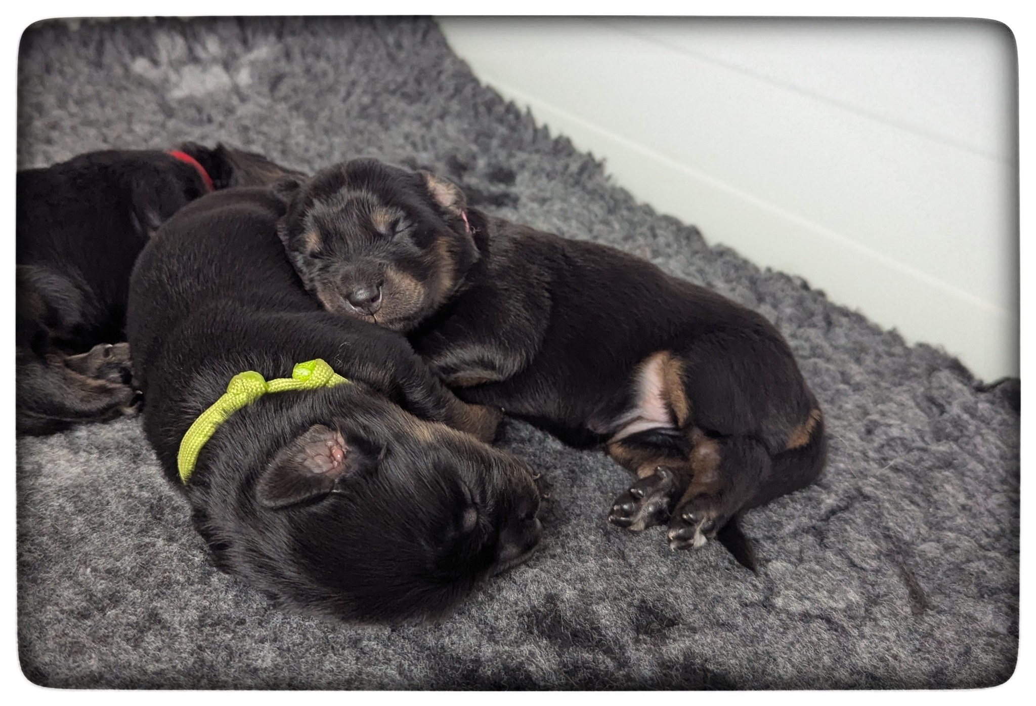 Unsere Zuchtwartin war sehr beeindruckt von der Ruhe und Gelassenheit die Cara ausstrahlt. Sie versorgt ihre Welpen sehr zuverlässig und ohne jede Hektik. Selbst wenn die Welpen mal unruhig werden oder lauthals Protestieren, leibt sie sehr souverän. Entsprechend sind auch die Zunahmen. Wir sind sehr begeistert von ihrem Verhalten. Bisher haben das zwar alle unsere Hündinnen sehr gut gemacht aber Cara ist da echt nochmal ne andere Hausnummer.