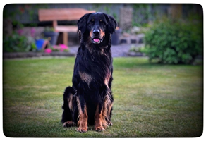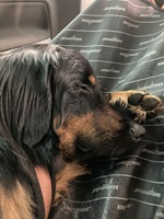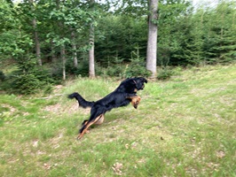 Ein 2,5 Jahre alter schwarzmarkener mittelgroßer, rassetypischer Rüde, von mittlerer Knochenstärke und mit ansprechendem Kopf. Vorzüglich gesetzte, flammende Marken, kleiner Brustfleck, Behang ohne Beanstandung, mittelbraune Augen, anliegende Lefzen, vollständiges Scherengebiss, P1 doppelt. Hamonische obere und untere Linie, korrekte Rute und einwandfreie Winkelungen. Die Läufe sind gerade gestellt. In der Bewegung zeigt sich der Rüde etwas hektisch, weshalb er sein Gangwerk nicht wirklich entfalten kann. Er läuft aber flüssig. Gepflegtes schichtes glänzendes Haarkleid. Vorzüglich am Futter. Er zeigt sich freundlich.