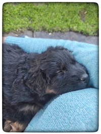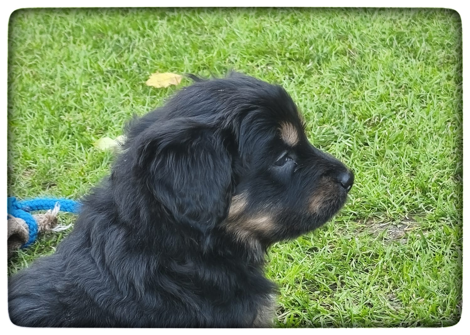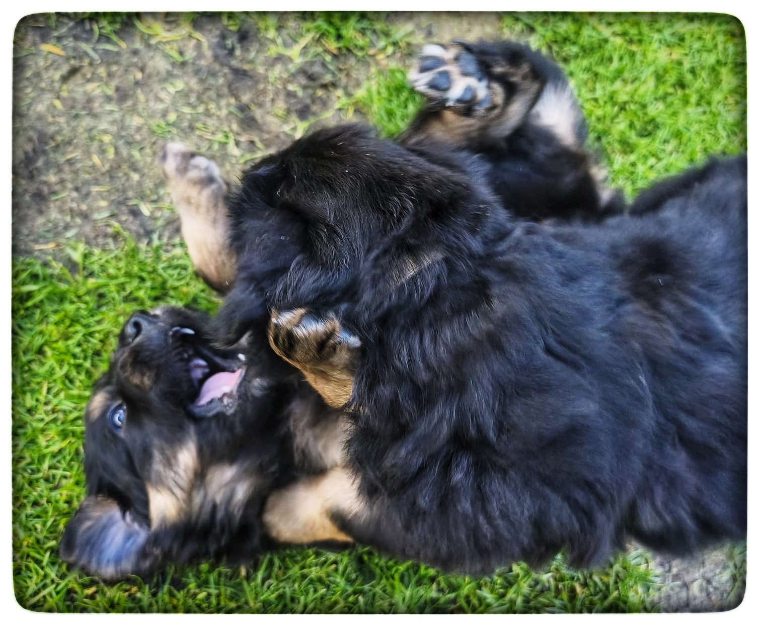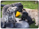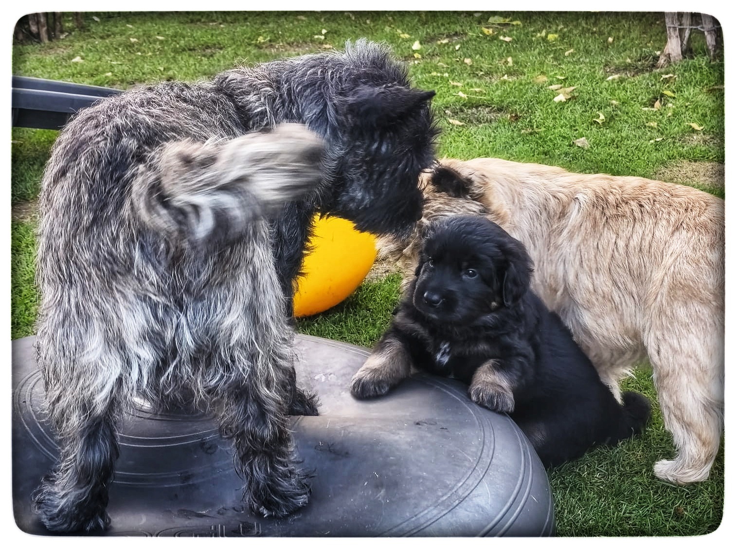 Die Welpen entwickeln sich prächtig und meistern mutig die Herausforderungen, die wir ihnen in dem Auslauf zur Verfügung stellen. Neugierig wird geäugt, was wir ihnen bereitstellen. Natürlich sind die Dinge dem Alter entsprechend angepasst.